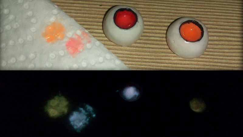 Яркие круги - места, куда я светила ультрафиолетовым фонариком, от него заряжается мгновенно, и светится ярче, чем от обычной лампы. Особенно красиво смотрится, если зарядить верхний слой и перемешать - похоже на лаву в пакетике или светящиеся трещины.