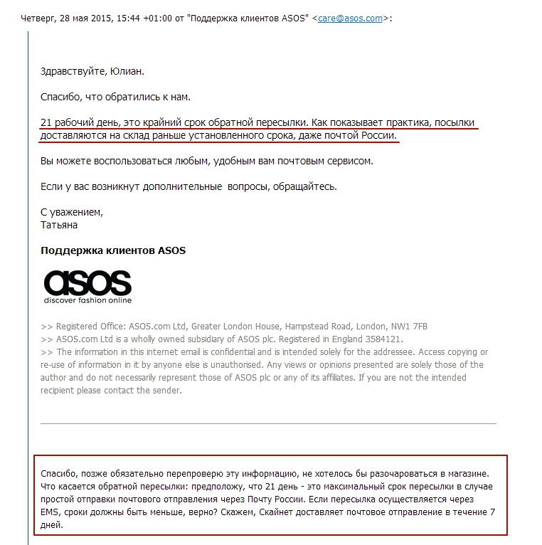 Если уж ASOS ставит в очередь почти на месяц, чтобы обработать возврат бракованного товара.