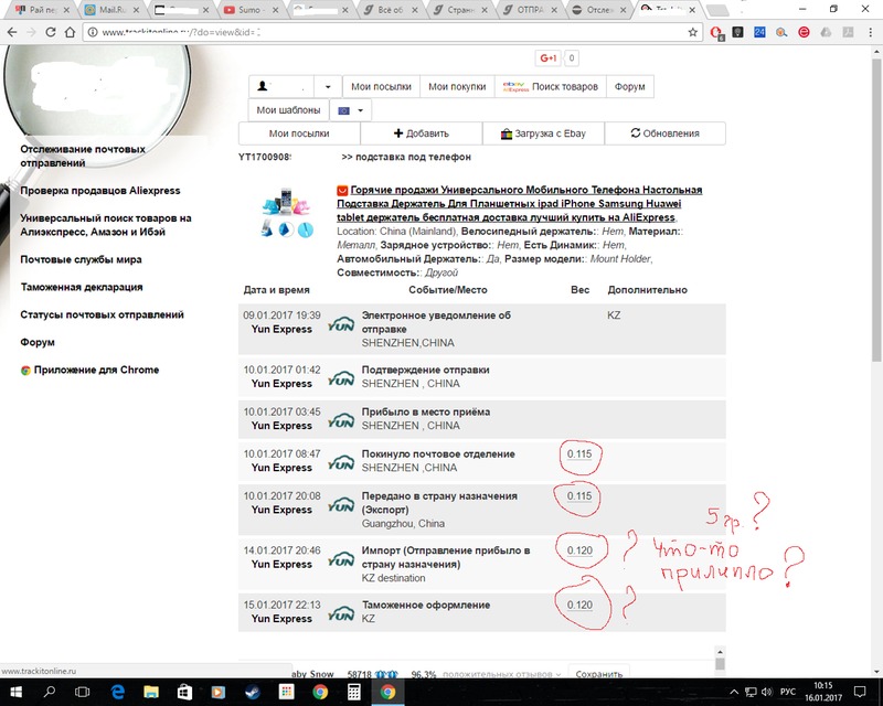 Посылка уже 7 дней в пути и 6 дней отслеживания 9.01 по настоящее время где 15.01 посылка судя по записям уже прошла таможенное оформление... но как правило post.kz эти вопросы фиксирует на своем портале но этого нет. Плюс еще одно сомнение как пишут в интернете то Yun Express фиксирует отслеживание только на территории отправителя т.е Китая.