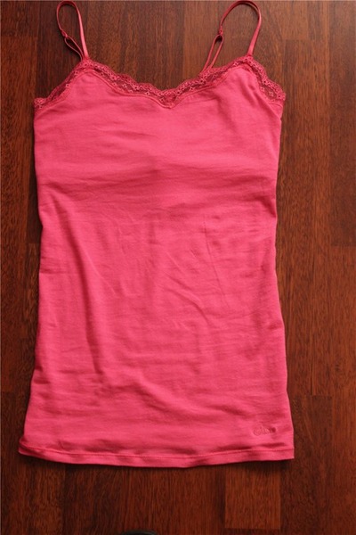 На мне топ сидит очень плотно, можно было, наверное, и размер М взять, но и в данном размере неприятных стягивающих ощущений не возникает. Ткань тонковата - хотелось бы, конечно, поплотнее. И еще - он длиннее остальных топов на два сантиметра, что довольно заметно, поэтому в районе бедер и собирается складками.