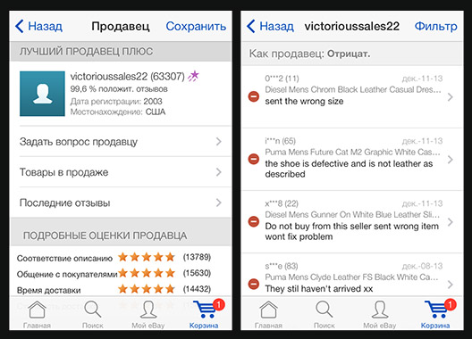 Просмотр сведений о продавце тоже не вызывает никаких трудностей. Просто тапаем по нику продавца и попадаем на его персональную страницу, на которой уже можно более детально ознакомиться с его рейтингом и отзывами, оставленными другими покупателями.