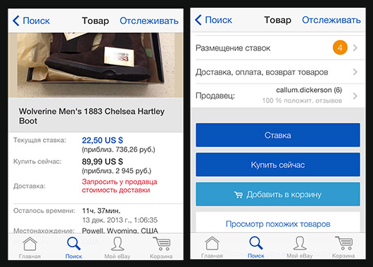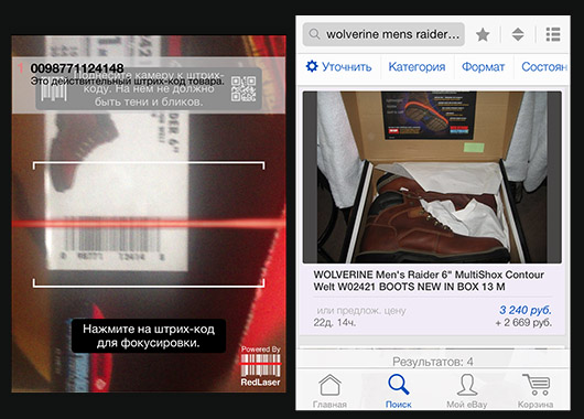 В качестве примера я взял коробку от купленных ранее ботинок Wolverine. Программа буквально за пару секунд отсканировала код, сообщила что этот код действительный и тут же показала мне 4 предложения таких же ботинок на eBay.