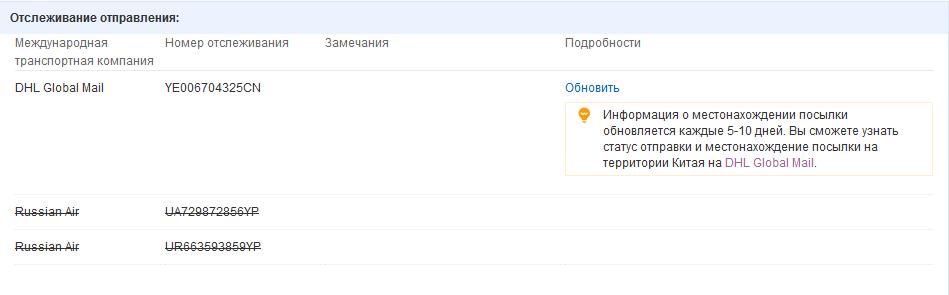 Доброго Всем времени суток! Продавец за последние 4 дня указал ТРИ разных трек кода. Первые два зачеркнуты. Они относились к Russian Air (за который я заплатил). Последний (третий) трек код относится к DHL Global Mail. Эту транспортную компанию я не выбирал. Подскажите о чем говорят эти маневры продавца? Последний трек код YE006704325CN (приложен файл). На мои письма продавец не отвечает. Заранее благодарен за ответ!