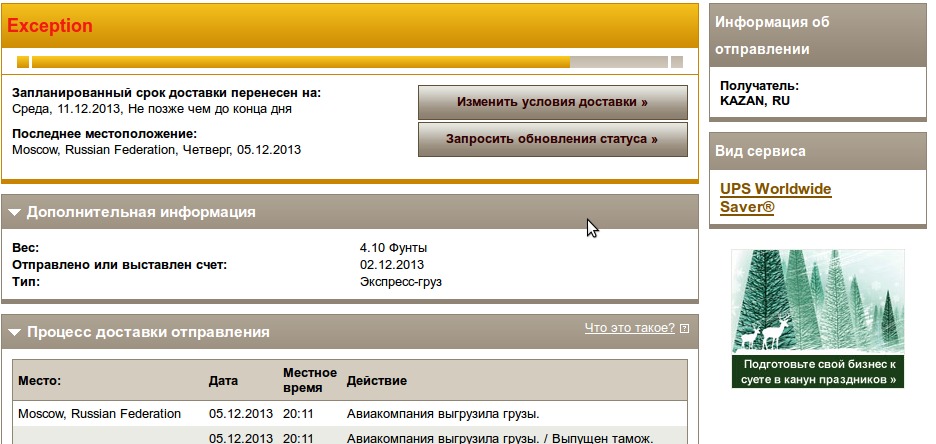 Честно признаться я такое движение у UPS первый раз вижу. С чем это может быть связано сказать сложно. Попробуйте завтра хотя бы в казанский офис UPS дозвониться и задать вопрос. У Вас вообще расчетное время доставки на сайте UPS какое указано?