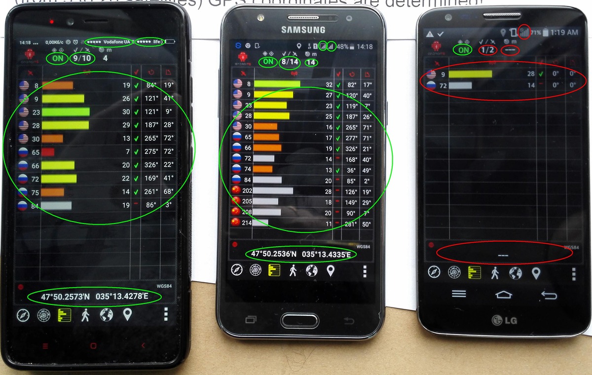 3. Выяснили, что GPS не работает. Запустили программу AndroiTS GPS Test - показывало 0 или 1 спутник. У телефона рядом - 5-15 спутников.