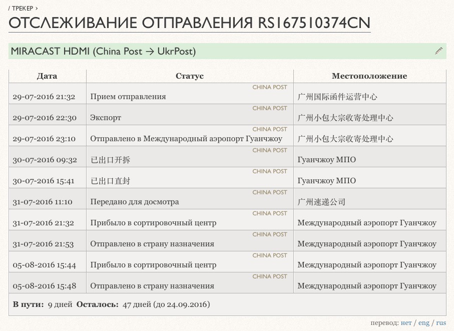 Это понятно, просто иногда ждешь нужную тебе вещицу, смотришь информацию по отслеживанию, сомнений не возникает в правдивости, а тут - на тебе. Пять дней она где-то провалялась в Гуанчжоу. Хотя могла уже быть на сортировке в Киеве. И не факт что последние строчки тоже правда и она уже покинула Китай.