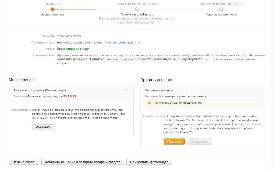 Все верно вам написали, от себя добавлю-ни в коем случае не закрывайте спор ни при каких условиях иначе снова открыть его не сможете т.к время защиты заказа истекло. Ждите решения Али