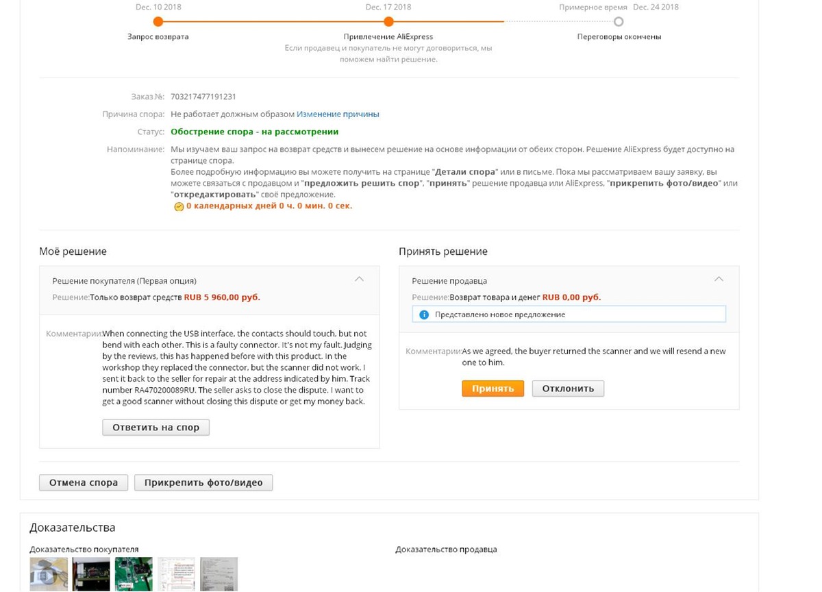Можно ли вовремя обостренного спора нажимать кнопку «Принять», если решение продавца: «Возврат товара и денег: 0 рублей.», Комментарий: «Как мы и договаривались, покупатель вернул сканер, и мы вышлем ему новый.»?