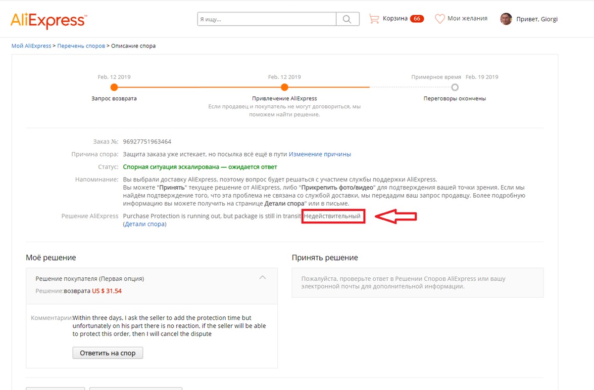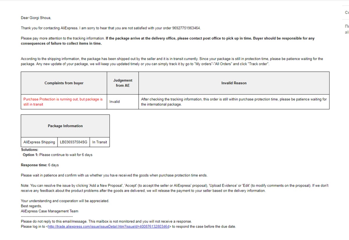 Здравствуйте, мой заказ в пути уже 74 дня, уже разок я просил продавца добавить время защиты и он добавил но маловато, несколько дней назад я стал просить его что бы он добавил еще но ответа так и непоследовало, вчера до завершения защиты оставалось 4 дня и я открыл спор по причине; посылка в пути а защита заканчивается, к спору я приложил 2 скрина, 1 скрин отслеживания 2 скрин переписки с продавцом где видно что я в течении трех дней прошу продавца добавить время защиты, как только я нажал кнопку отправить моментально появилось решение али где они отказывают мне и просят подождать 6 дней несмотря на то что до окончания защиты остается всего черыре дня, что это за херня я не могу понять, и что мне делать тоже, ждать не отменяя спор? или отменить его и в последний день открыть его вновь? в трех скринах видна вся подробная информация, если кто сталкивался с такой ситуацией прошу помогите пожалуйста