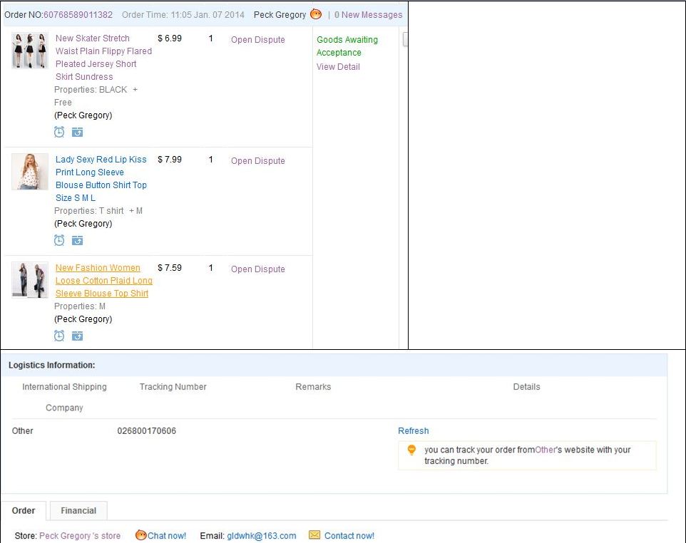 В общем сделала заказ 7 января от одного продавца на три вещи (отзывы и рейтинг хорошие, 1 коронка). Уже через 2-3 дня появился статус Confirm Order Recieved и выставлен вот такой странный номер трека 026800170606. Продавец не отвечал на сообщения вообще нигде (почта, чат, contact now и т.д.)