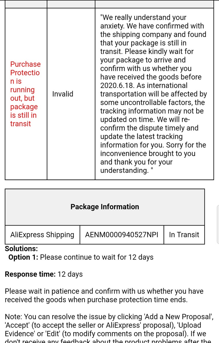 Привет всем. Посылка в пути больше двух месяцев. Открыл спор с формулировкой "защита истекает, но товар не получен" но забыл, что продавец продлевал защиту ещё на месяц. АлиЭкспресс соответственно мой спор отклонил и вынес такое решение. Вопрос собственно такой, мне можно просто подождать 12 дней с открытым спором или делать какие-то иные действия?