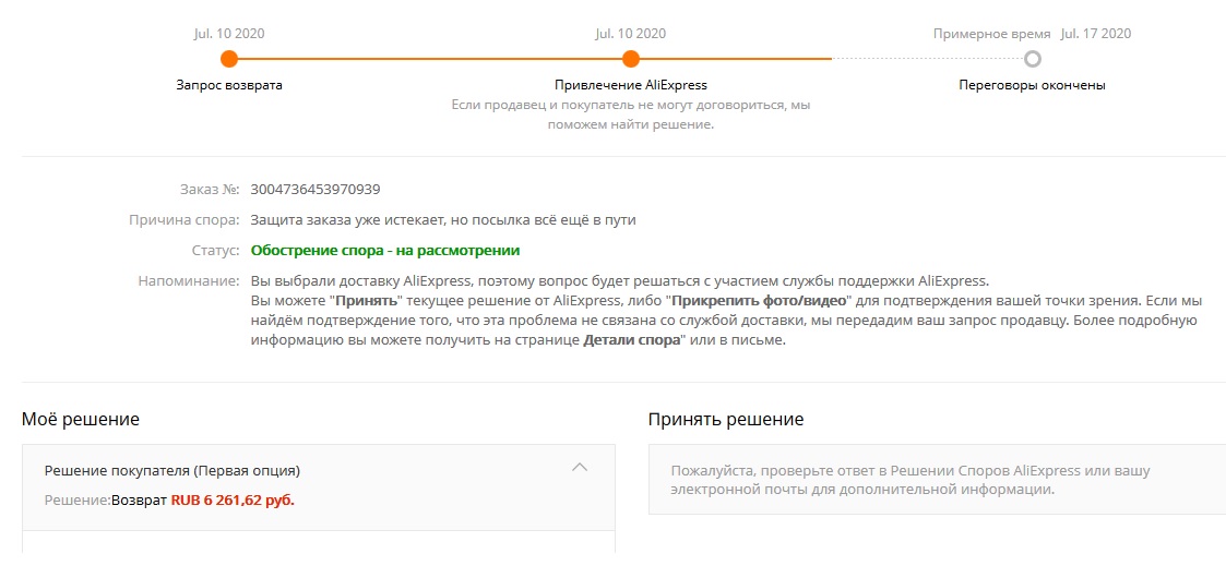 Открыл спор на возврат денег еще 10 июля. Ожидаемый срок решения спора 17 июля.