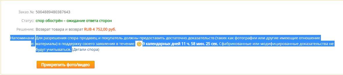 Добрый вечер. Пришли бракованные смарт-часы. Продавец предложил вернуть товар обратно в Китай, что я и сделал, но так как посылка задержалась в сортировочном центре в Химках, срок доставки отправления истёк.Сегодня вижу, что статус спора изменился на "спор обострён – ожидание ответа сторон ", напоминание: для разрешения спора продавец и покупатель должны предоставить достаточно доказательств (таких как фотографии или другие имеющие отношение материалы) в поддержку своего заявления в течение 9 календарных дней 11 ч. 58 мин. 47 сек. Сфабрикованные или модифицированные доказательства не будут учитываться.В деталях, то есть письме от алиэкспресс, было написано: Спасибо, что обратились к AliExpress. Сожалею, что вы не удовлетворены своим заказом 5004889480387643.На основании информации об отслеживании мы обнаруживаем, что товар возвращается продавцу. Мы уведомим продавца, чтобы подтвердить получение товара до 2020-10-20. Если проблем с возвращенными товарами нет, мы вернем вам деньги.Примечание. Вы также можете решить проблему, нажав «Добавить новое предложение», «Принять» (чтобы принять предложение продавца или AliExpress), «Загрузить доказательства» или «Изменить» (чтобы изменить комментарии к предложению). Если вы урегулировали спор с продавцом, пожалуйста, дайте ответ на странице подробных сведений о споре, чтобы мы могли быть проинформированы и проследить этот спор на основе урегулирования. Будем признательны за ваше понимание и сотрудничество.Что это значит? Мне нужно предоставлять какие-то доказательства?