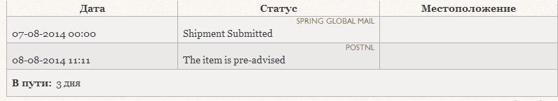 Не совсем так. Посылка 7 августа уже попала в руки Spring Global Mail, так что все-таки уже отправлена. Просто еще не долетела до Нидерландов (и до Почты Нидерландов).