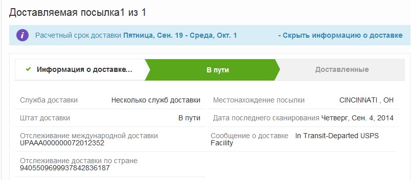 Добрый день! Купил товар на eBay 31.08.2014. Продавец отправил 02.09.2014. Дал не понятный трек номер. Я часто заказываю товар из США, но такой странный трек номер встречаю впервые. В описании доставки написано "Включен номер для отслеживания международной доставки". Продавец прислал чек какой-то не понятный. Фото прилагается. Помогите пожалуйста разобраться. Что и как? Какие сроки доставки, где отслеживать и т.д... Спасибо за ответ!