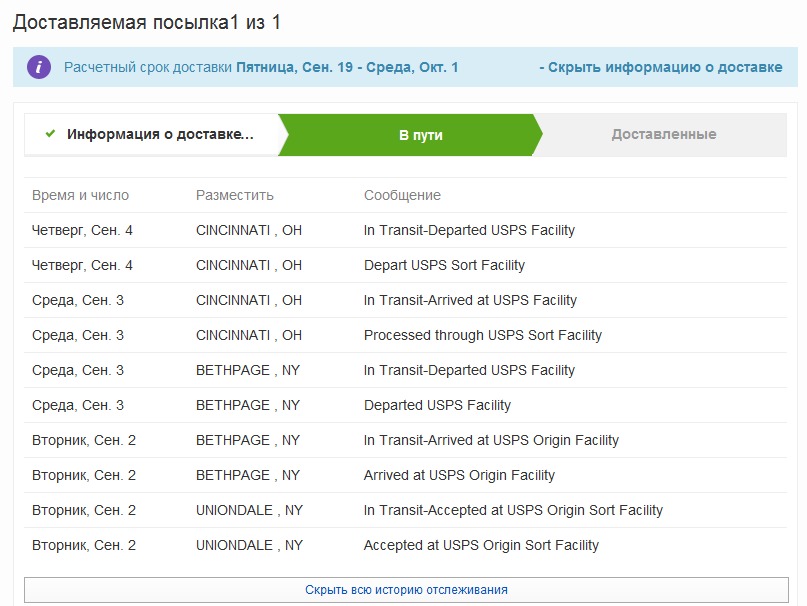 Добрый день! Чтобы не создавать новый вопрос, решил ответить вам, то есть задать вопрос по новой посылке. Заказал на eBay товар, способ доставки такой же как и описанно выше. Дело в том, что эта посылка движется по другому, никак первая. Отслеживание показывает: Местонахождение посылки TPC LA, и вот это: Понедельник, Сен. 29 TPC LA , In Transit with Destination Carrier. Что это означает? Первая посылка пришла быстра. Эта что то не могу понять.