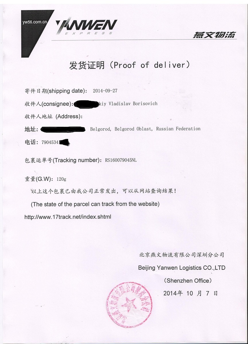 Здравствуйте. Пречитал кучу FAQ'ов, много похожих проблем, но такой же не нашёл, так что решил спросить. Ситуация следующая. 24.092014 заказал блютуз - гарнитуру в Китае, продавец дал мне трек - код RS160079045NL (отправной пункт - Нидерланды). Ладно, жду что будет дальше. По прошествии 10 дней после отправки ни один трекер такой код не знает. Задаю вопрос продавцу, получаю ответ мол "не волнуйтесь почта Китая перегружена, надо ждать". Все заказы, которые делал и до этого и после начинали отслеживаться сразу. 7.10.2014 открыл спор и сказал продавцу что не закрою пока не получу доказательства отправки. Он прислал невнятную бумажку (в аттаче). Спор закрыл но душа не на месте. Досихпор ни один трекер такой код не видит, кроме Вашего, а на Вашем по этому коду ни страны нахождения товара, ни вообще чего либо конкретного... Заранее спасибо.