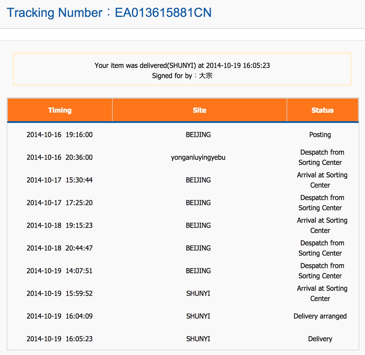 Your item was delivered(SHUNYI) at 2014-10-19 16:05:23Signed for by:大宗