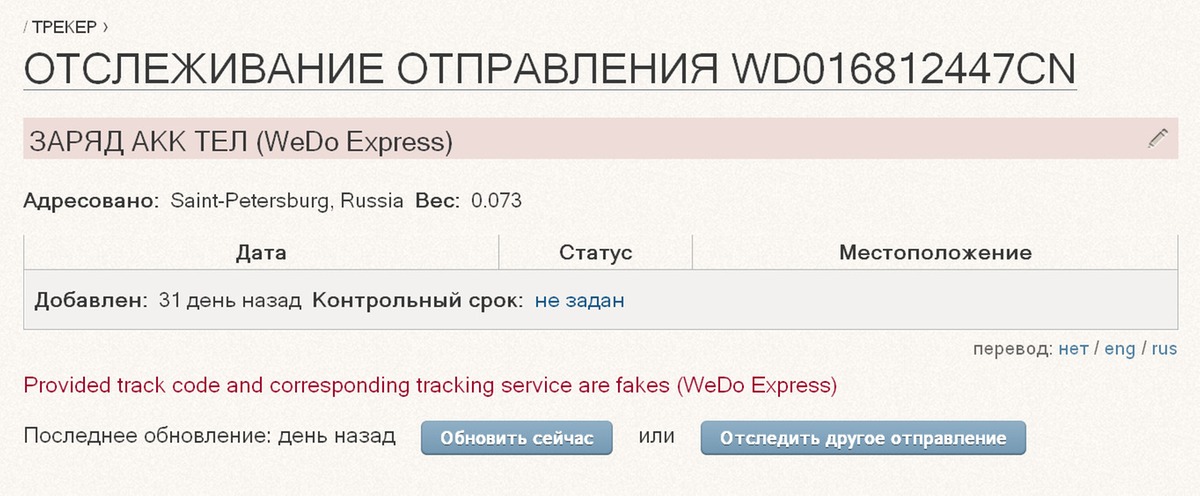 при попытке обновить трек здесь на сайте выдано сообщение Provided track code and corresponding tracking service are fakes (WeDo Express)и что это значит?
