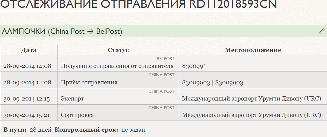 По трек номеру видно ,что прилетели в страну и всё.Думаю зайду на почту спрошу,может где завалялись.Выдали 2 посылки.Ну думаю,наконец то,получил аккумуляторы.Оказалось 1 посылка которая YC231735254YW[2014-09-10 00:00]Belarus Arrive at Belarus Airport давно лежит на почте,но это оказались не они.А вторая посылка с лампочками.Трек номер на них продавец дал такой RD112018593CN.На посылке этого трек номера не было.А аккумуляторы до сих пор не понятно где:(