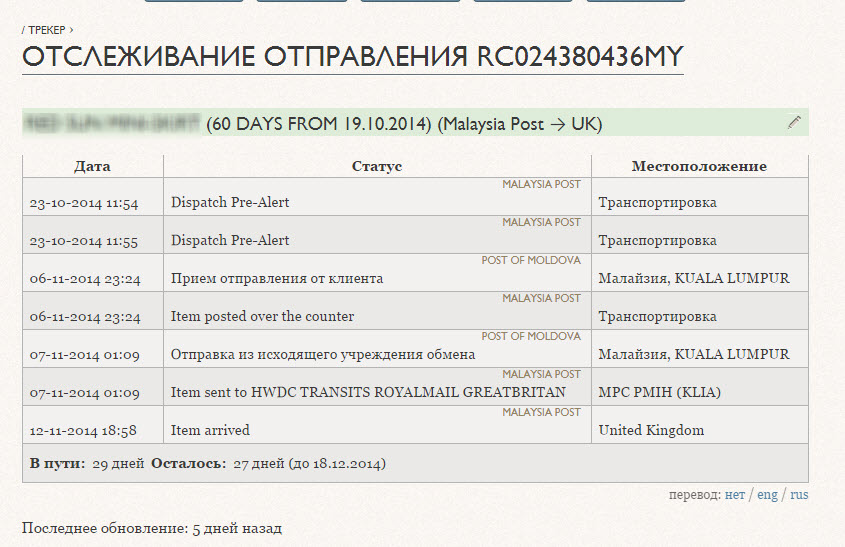 Помогите разобраться. Когда мне дали этот трек код RC024380436MY, то изначально страной назначения значилась моя страна (Молдова). Пять дней назад, когда трек обновился, я увидела, что страной назначения стала уже Великобритания. Дальше трек не отслеживается. Я не понимаю как такое может быть и куда идёт моя посылка