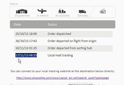 30.10.2013 18:08:26 PDT (31.10.2013 03:08:26 по Киеву) - Я отписал продавцу, что вижу активность трека.