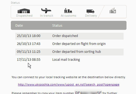 С 16.11.2013 DirectLink пишет "Local mail tracking", но трек в Украине не появился до текущего момента (24.11.2013 14:21)