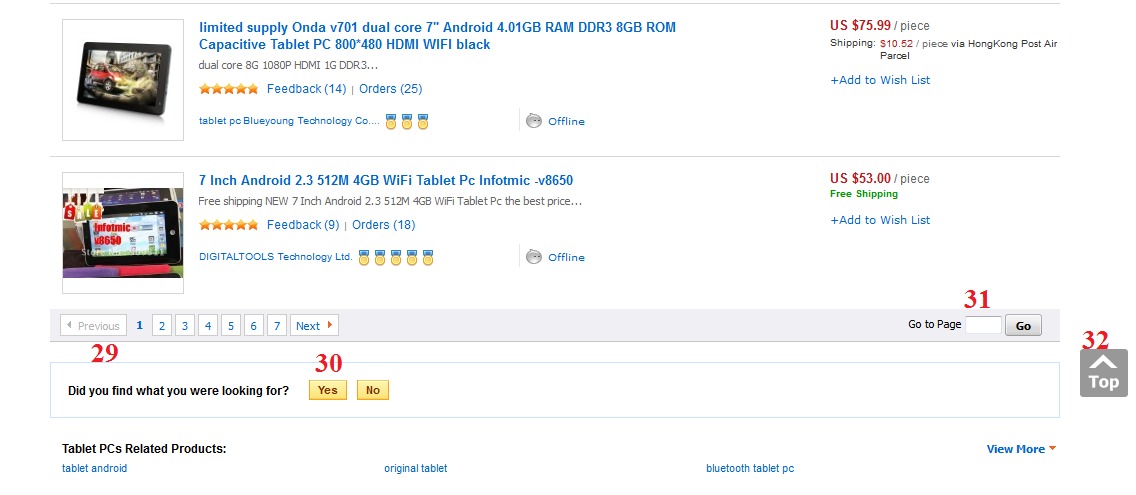 Выберем раздел "Computer & Networking" и подраздел "Tablet PCs". На скриншоте цифрами отображены ключевые функции сортировки товара и содержимое подраздела.