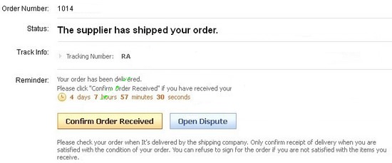 "На подтверждение получения заказа покупателю дается 7 дней с момента когда в системе отслеживания почтовых отправлений появится статус "Доставлено", в случае если такая доставка уложилась в выделенный Aliexpress срок доставки.
