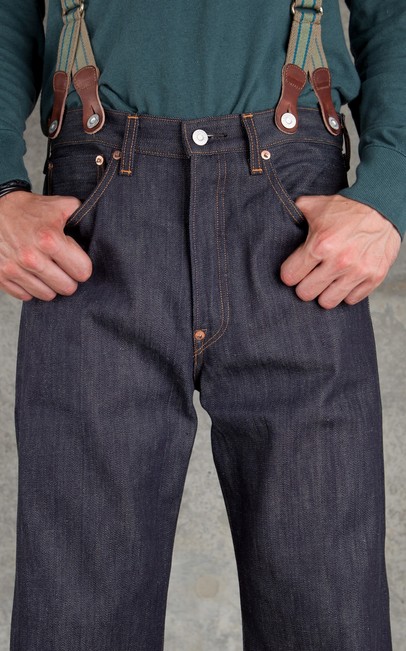 Первоначально джинсы тех времён имели на поясе пуговицы, предназначенные для крепления помочей и "чинчбэк" (своеобразный "хлястик" сзади) для регулировки размера в поясе. На этом фото мы видим некоторое отступление от "исторических канонов" - на этой реплике 501 1922 имеются как шлёвки для ремня так и пуговицы для помочей, чего в то время не было. Это сделано для удобства современных людей, ведь не каждый в погоне за исторической достоверностью готов щеголять в джинсах на подтяжках. Ещё одна пикантная деталь - первоначально джинсы Levis имели ещё одну заклёпку в паху ("кротч райвет"), однако со временем компания отказалась от этой детали, возле костра заклёпка накалялась, доставляя золотоискателям и ковбоям немало хлопот.