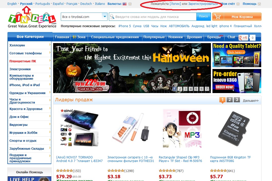 Начнем по порядку. Заходим на сайт - www.tinydeal.com, вверху, над логотипом (смотрите на красную стрелку на скриншоте), видим доступные языки, выбираем нужный язык, если, конечно, сайт сам уже не выбрал его автоматически. Также рядом с языком, можем выбрать желаемую валюту (русских рублей нет). Далее, нажимаем на кнопку "Логин" или на кнопку "Зарегистрироваться".