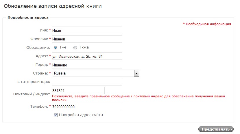 В поле "Штат/провинция" не вводим ничего, если только Вы не живете в США.