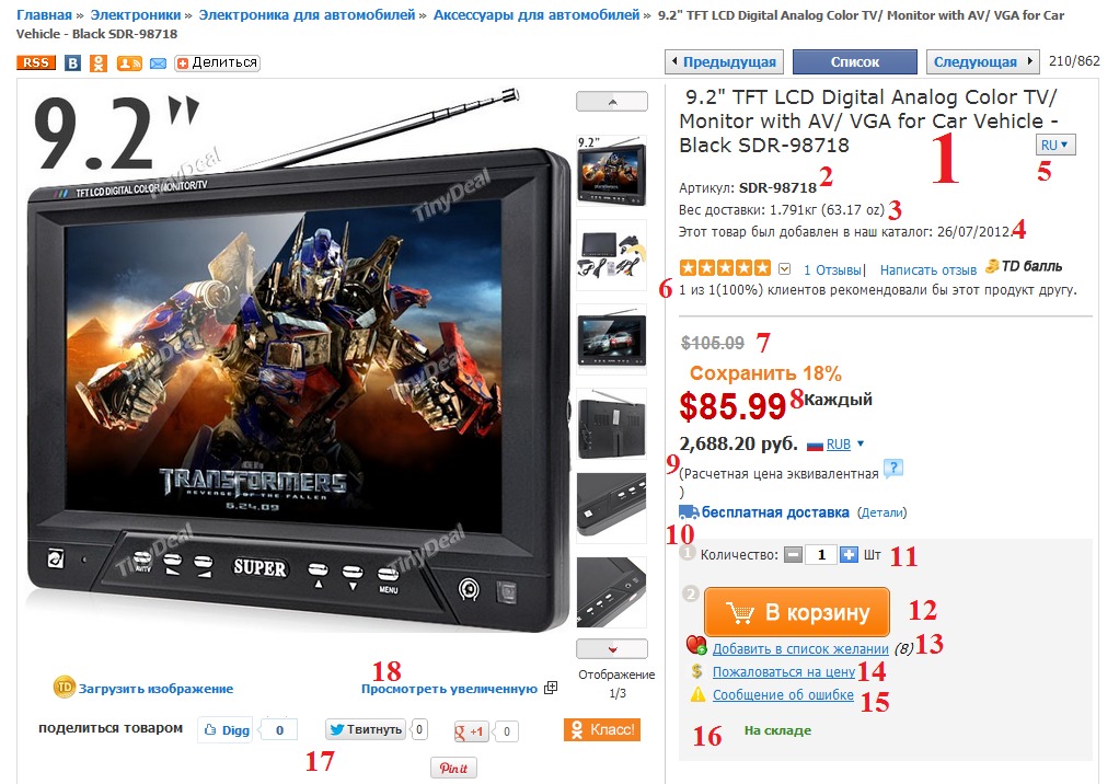 5) С помощью этой функции можно выбрать желаемый язык, если, конечно описание товара переведено на другие языки. Как видим, на русский язык описание этого товара не перевели.