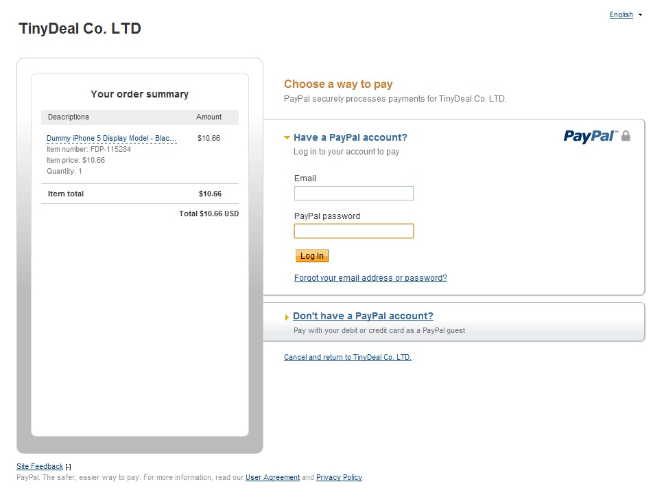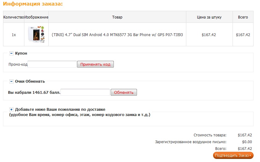 Обман начинается сразу как только вы делаете заказ. При выставлении счета на оплату сумма оплаты заказа каким то образом увеличивается на 10% от той по которой вы делали заказ. Время обработки заказа на сайте указано 1-2 дня! Ваш заказ будут обрабатывать… устанете ждать! На вопросы в онлайн чате и по электронной почте у них стандартный набор «отмазок» - «подождите 2-3 дня», «мы готовим», «мы проверяем», «спасибо за ваше понимание и терпение» и так далее в таком духе – короче включают «дурака»! Когда нам это все порядком надоело, делаем отмену заказа и требуем возврат денежных средств. Они снова включают «дурака» в виде аналогичных продолжительных бесед в чате и при переписке по электронной почте. В итоге они делают все же нам возврат денежных средств…. но пойнтами TD!!! Пойнтами можно оплатить заказ, но не более 90%, 10% платить нужно «своими кровными» - опять «кидалово» и опять 10%!!! При попытке оплатить пойнтами новый заказ на сайте TinyDeal все расчитывается как и обещано минус 90% от суммы заказа, к оплате оставшиеся 10% , вроде все нормально. Но при попытке оплаты этих так сказать 10%, платежной системе (без разницы PaiPal, вебмани, яндекс деньги, банковская карта) выставляется счет наоборот с вычетом всего лишь 10% от общей суммы! Опять 10%!!! Для чего? Смотрим: допустим стоимость телефона в рублях 11500,50 рублей, 10% от стоимости 1150,05 рублей, то есть нам нужно заплатить «всего лишь» 1150,05 рублей, а счет на оплату платежной системе будет выставлен 11500,50 рублей (полная стоимость) – вся разница в разрядности цифр, а в общем то цифры одинаковые, только запятая не там где должна быть! Как правило на конечной стадии покупатель уже не обращает на это внимание, ведь на сайте TinyDeal все уже посчитано и к оплате всего лишь каких то $16! И… делает подтверждение оплаты. Если на счете достаточно средств – всё, мы распрощались еще с 11500,50 руб. и мы их уже никогда не вернем (шанс есть только если вы оплачивали через PaiPal, у них есть защита и можно вернуть деньги, «заморочек» тоже хватает).