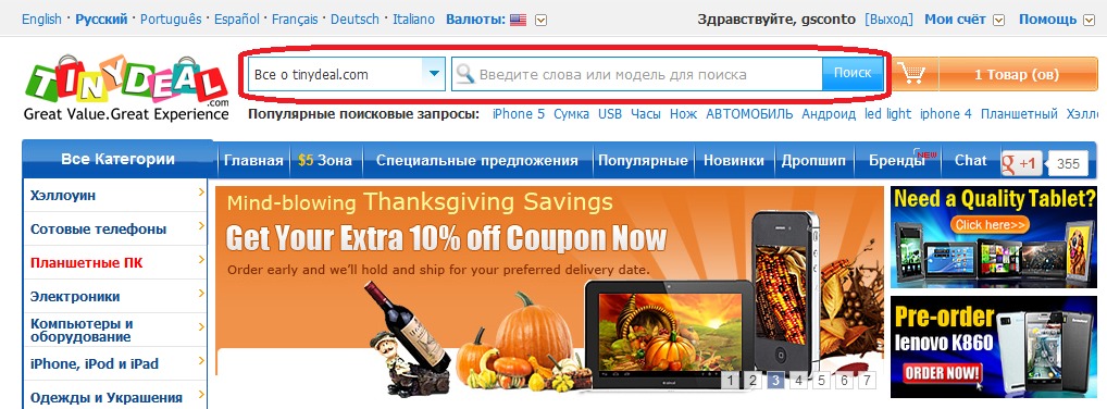 Можно произвести поиск по всем категориям сайта или выбрать, интересующую нас, одну. Выбрать ее можно в раскрывающемся списке, там где написано "все о tinydeal.com". В строке поиска названия товаров нужно вводить на английском языке (можно и на русском, но переведенных на русский язык описаний очень мало). Можно также ввести артикул товара (SKU).