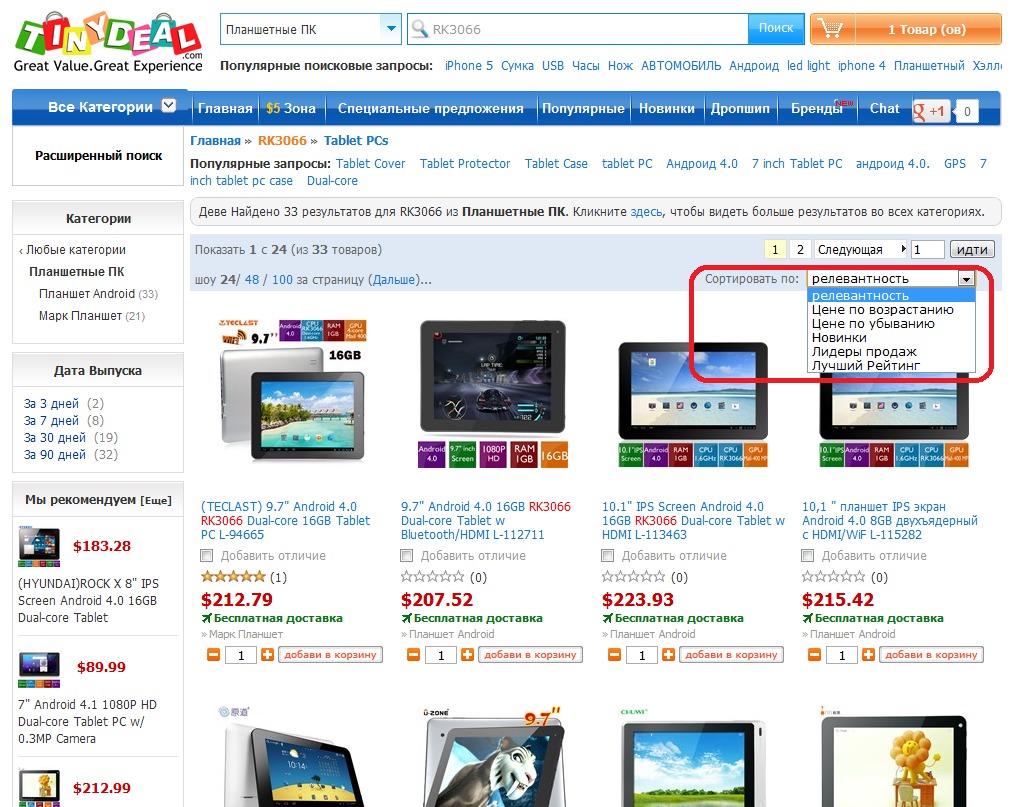 Поисковик нашел все планшеты с процессором RK3066. Далее, нам нужен планшет ценой до 250$. Делаем сортировку по цене. Можно выбрать сортировку по цене (по возрастанию или по убыванию), сортировку по новизне (первыми будут показаны планшеты, которые были недавно добавлены на сайт), по лучшим оценкам пользователям, по количеству продаж (первыми будут идти планшеты, которые лучше всего продаются).