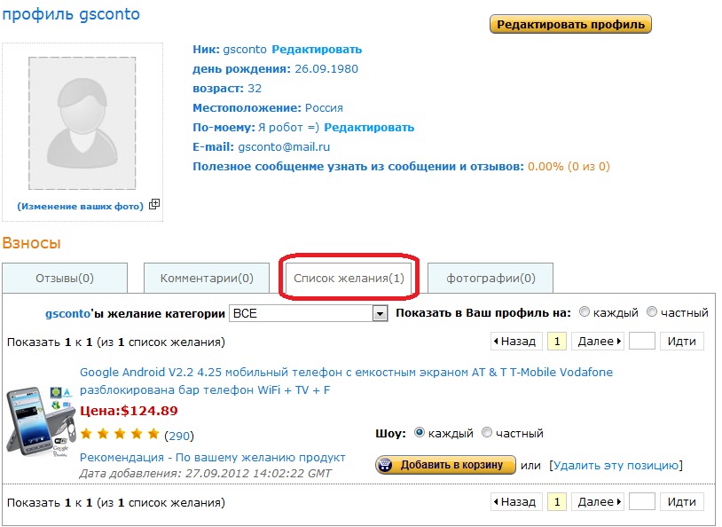 Также на сайте есть "список желаний" (Wishlist), в него мы можем добавить интересующие товары, которые хотели бы в будущем приобрести, чтобы не захламлять корзину.