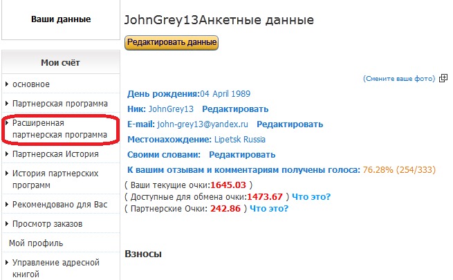Заходим в "Мой профиль" и ищем в левом боку "Расширенная партнерская программа"