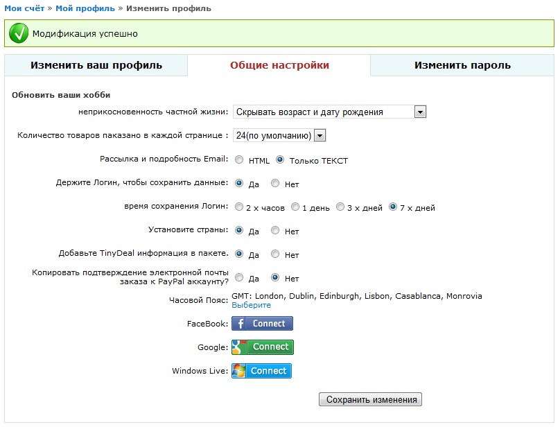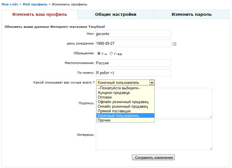 Итак, видим вот такую форму (см. рисунок). В поле "Ник" вводим свой никнейм (он будет отображаться в комментариях к товарам), дату рождения, выбираем свой пол, в графу "Местоположение" можете написать что угодно. Графу "По-моему" (ох, эти китайцы... их "по-моему" означает "пара слов о себе"), "Подпись", "Интересы" можно не заполнять. В графе "Какой описывает вас лучше всего?" выбираем "Конечный пользователь", если Вы собираетесь покупать товары только для своих нужд. Вообще, эта графа ни на что не влияет и всю эту информацию можно изменить в любой момент :) Заполнили? Тогда жмем "Сохранить изменения".