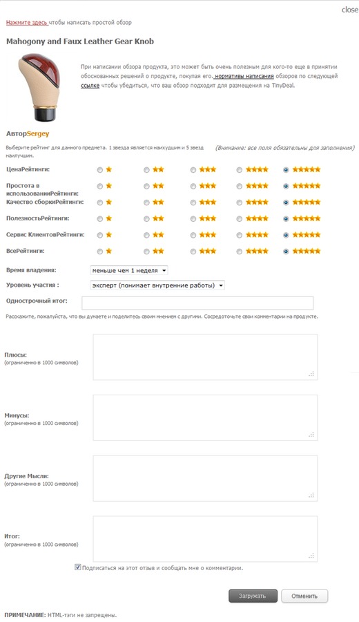 4) Никнейм на TinyDeal и на сайте, на который Вы добавляете обзор, должен быть одинаковым, либо быть очень похож. Например, на TD - gsconto, а на сайте - gsconto78. Это сделано для того, чтобы пользователи не "воровали" чужие обзоры, точнее не выдавали чужие за свои.