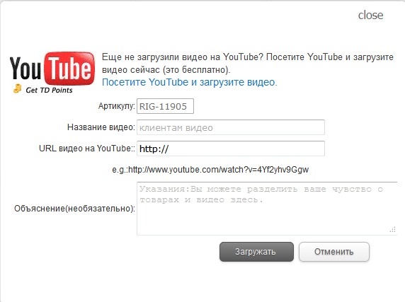 Нажимаем "Загрузите свое видео" и вводим название видео, ссылку на него на youtube и комментарий для менеджеров сайта (необязательно). После того как мы отправили ссылку, ждем 2-3 рабочих дня, пока её проверят и добавят видео на сайт, а также баллы на Ваш счет.